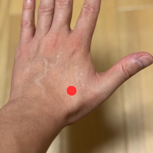 母指と示指の間で、骨と骨の合流部の際のやや示指側に合谷穴(赤色●)を取る。